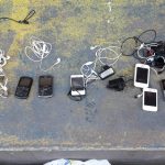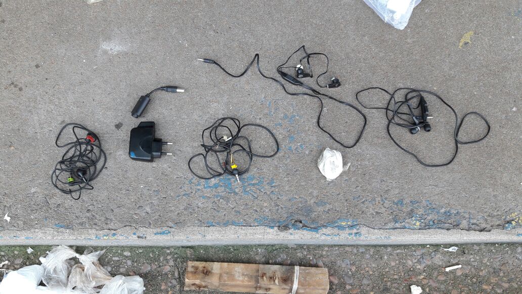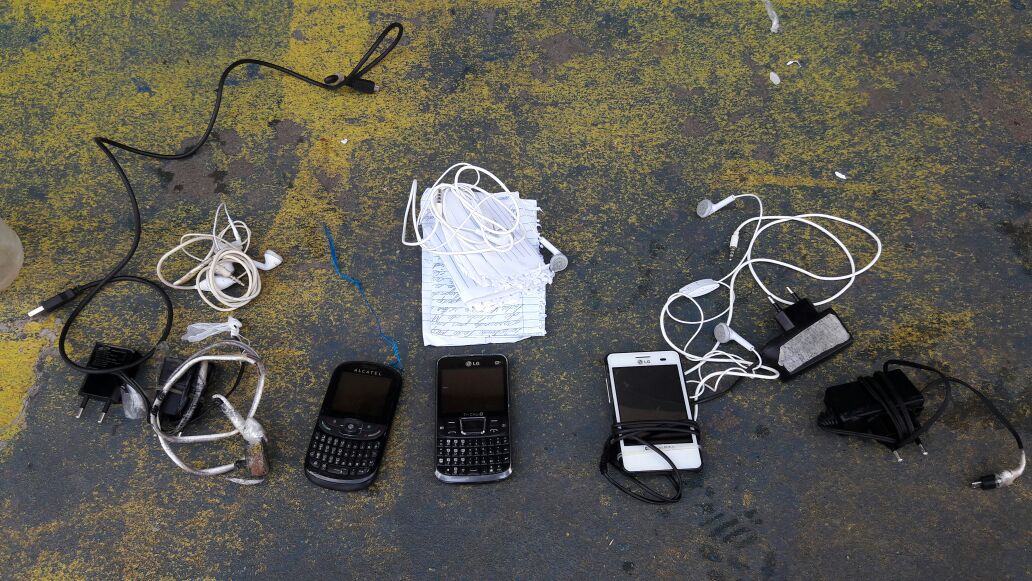 Durante as buscas nas galerias do complexo prisional foram encontrados 14 telefones celular, 10 carregadores de telefone celular, 12 fones de ouvido para telefones celulares, 06 chips de telefone celular, 02 trouxinhas de maconha.