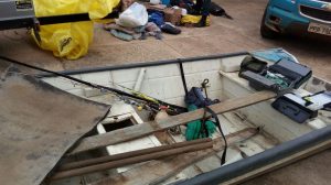 A guarnição da Patrulha Rural se deparou com três veículos pela MS 324 altura do km 14 sentido a Cachoeira Branca ou Barragem São domingos, situado no Rio Verde e protegida por leis ambientais, fora notado pelos policiais que um dos veículos transportava um barco, sendo assim foi realizada a abordagem deste veículo e constatado que além do veículo abordado que estava engatado a uma carretinha, também os outros dois veículos também transportavam varas de pesca, bem como iscas artificiais, anzóis e chumbadas de vários tamanhos dentre outros artigos de pesca. Momento que foram indagados se estavam cientes de que a pesca esta temporariamente proibida por lei como ocorre anualmente, assim foram enfáticos em dizer que tinham ciência do fato e responderam na tentativa de ludibriar os policiais que transportavam os objetos para guardar no rancho, porém logo confessaram aos policiais que adquiriram uma propriedade as margens do rio verde em um loteamento, e que no local não havia qualquer construção para guardar os materiais, dizendo que se deslocavam para a localidade aonde permaneceriam acampados pescando pelo período de três dias, confirmando que transportavam o material para praticar pesca e em local e período proibido., foi solicitado o apoio da Policia Militar Ambiental do Estado Do Mato Grosso do Sul para confecção dos procedimentos administrativos e multas e desfavor dos autores.