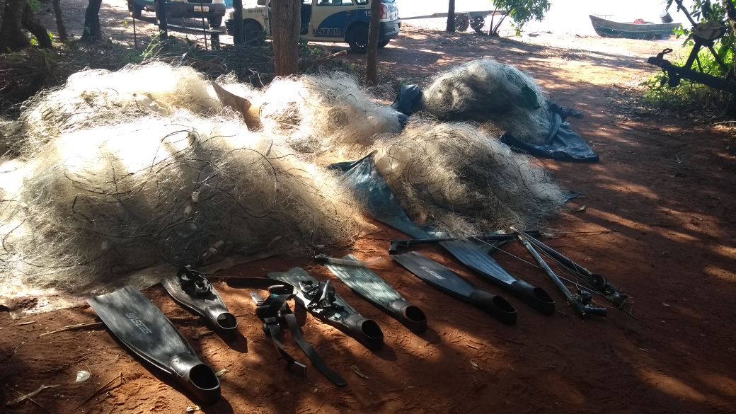 Foram apreendidos em posse dos indivíduos um botijão de gás, uma bateria, dois cinturões com pesos, três pares de nadadeira, dois snorkels, dois óculos de mergulho, dois motores de potência de 40HP, um barco de borda alta, roupas de mergulho, dois arbaletes e um arpão, todos itens utilizados na prática da pesca ilegal além de uma caminhonete Chevrolet D20 de cor vinho. Dois indivíduos não portavam licença para esta atividade, apenas um deles alegando ser pescador profissional apresentando os seguintes documentos: autorização ambiental para pesca comercial, com número ilegível. Diante dos fatos os autores foram conduzidos e entregues à Delegacia de Polícia Civil local.