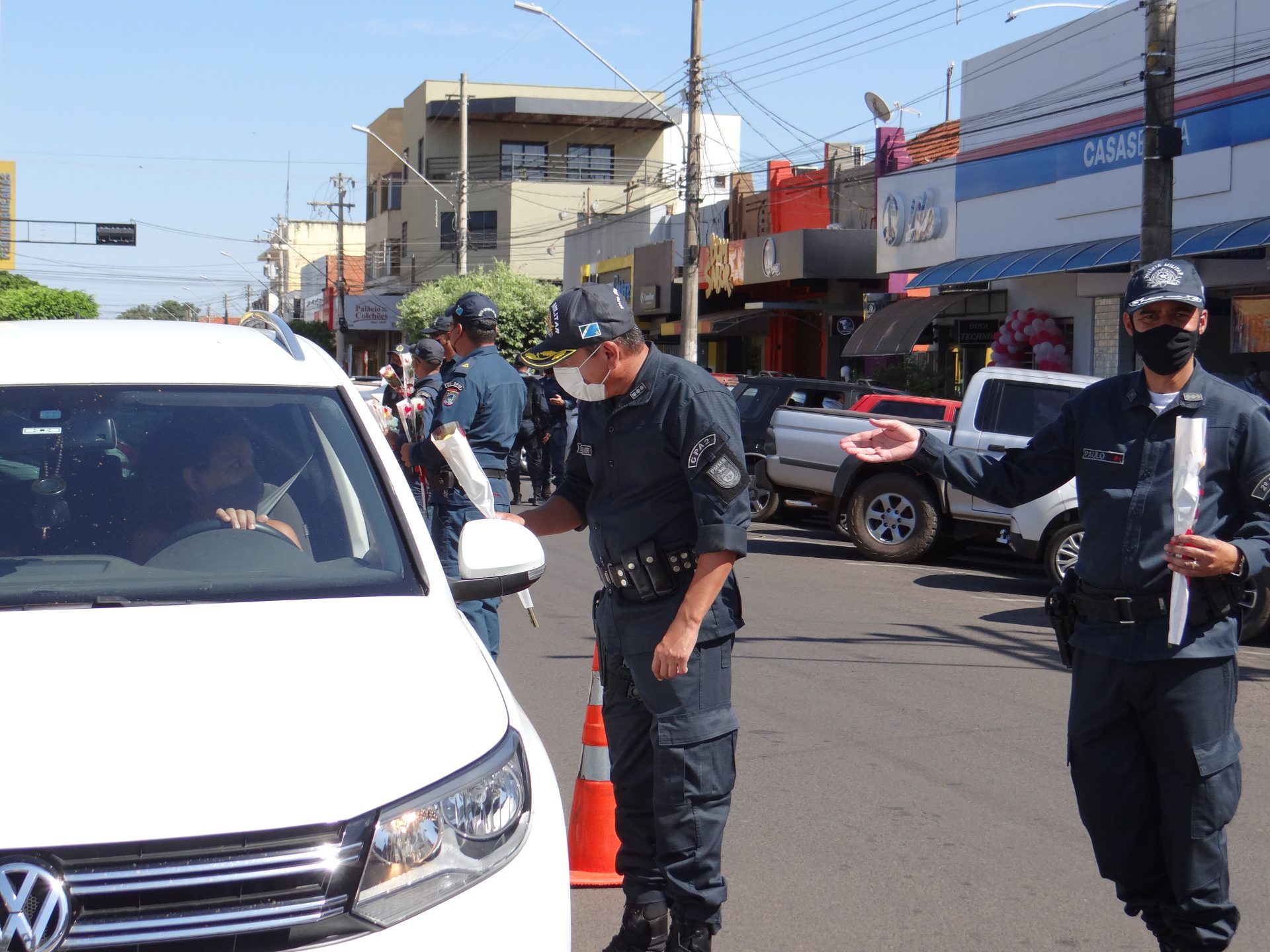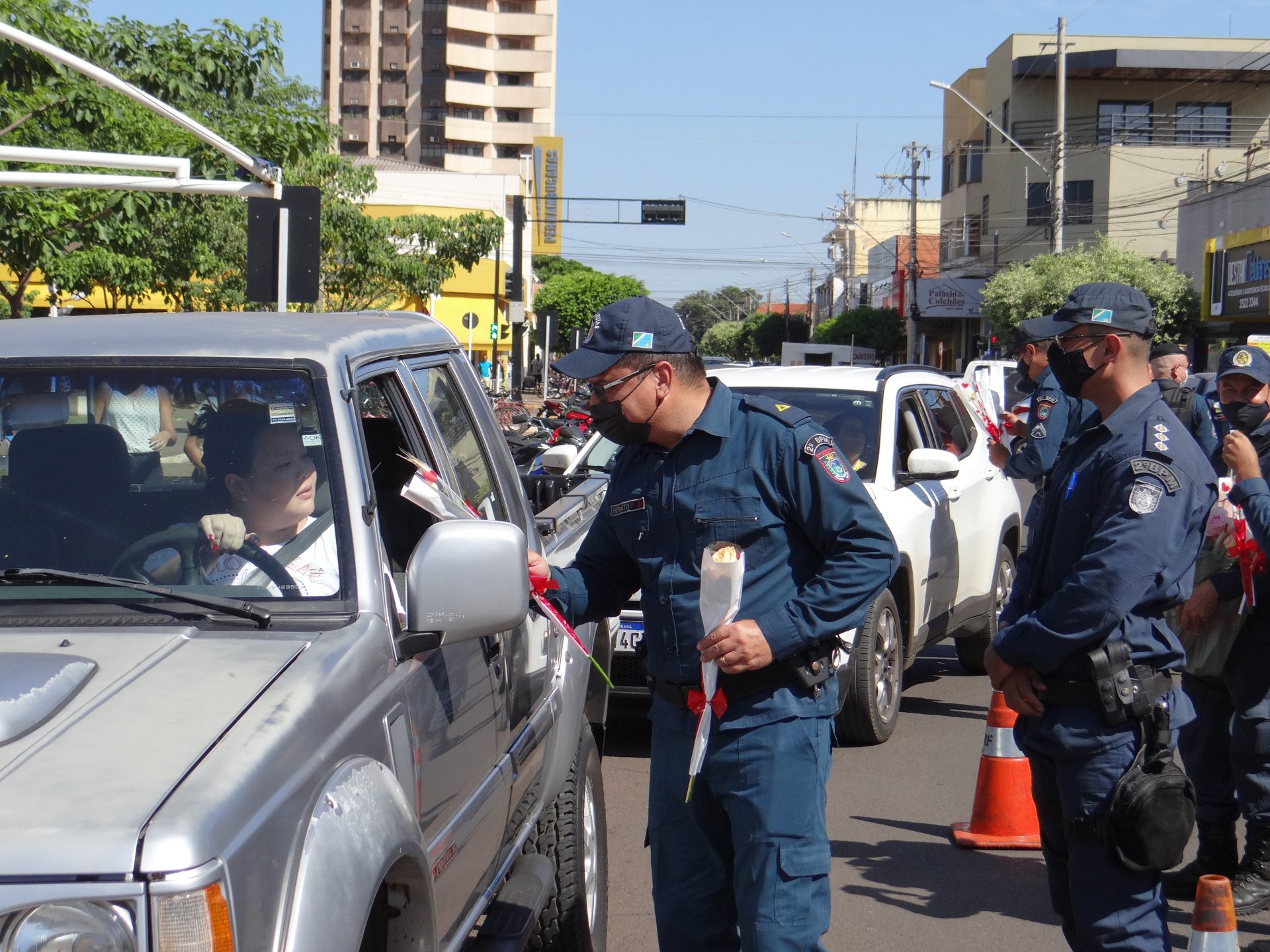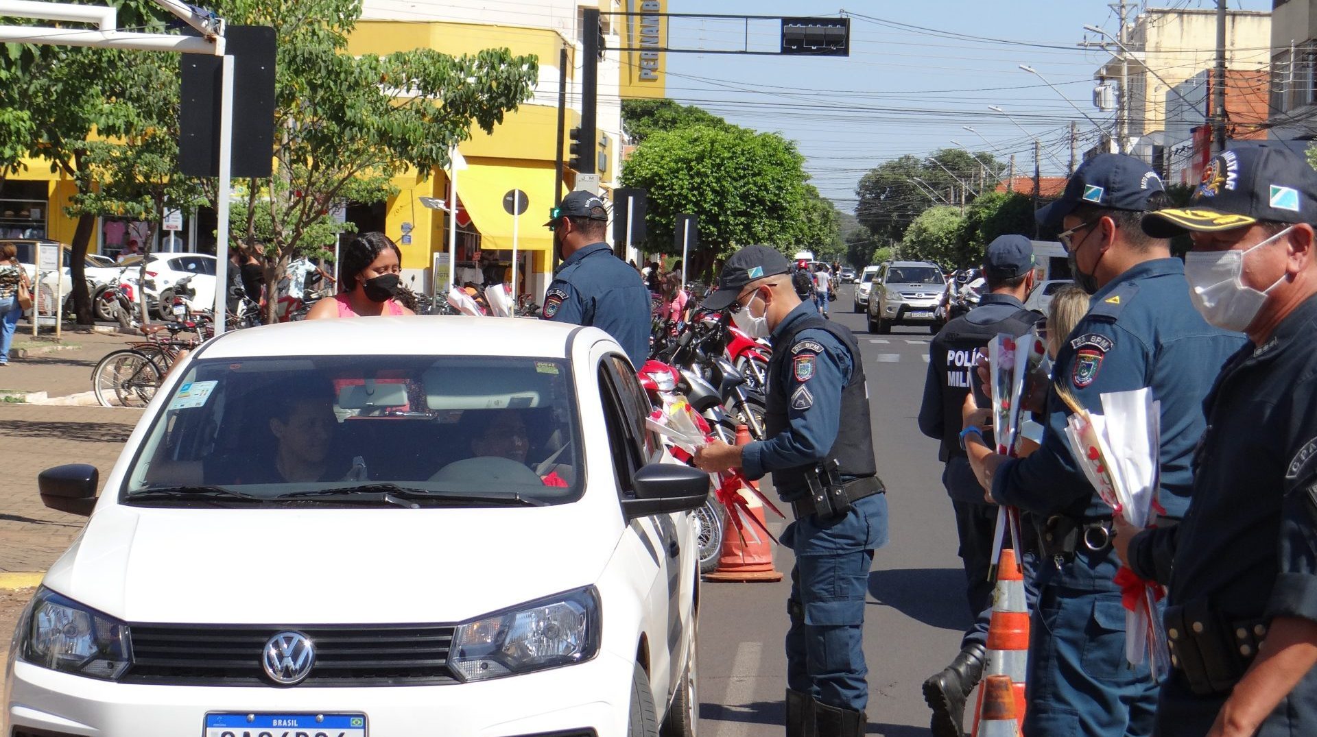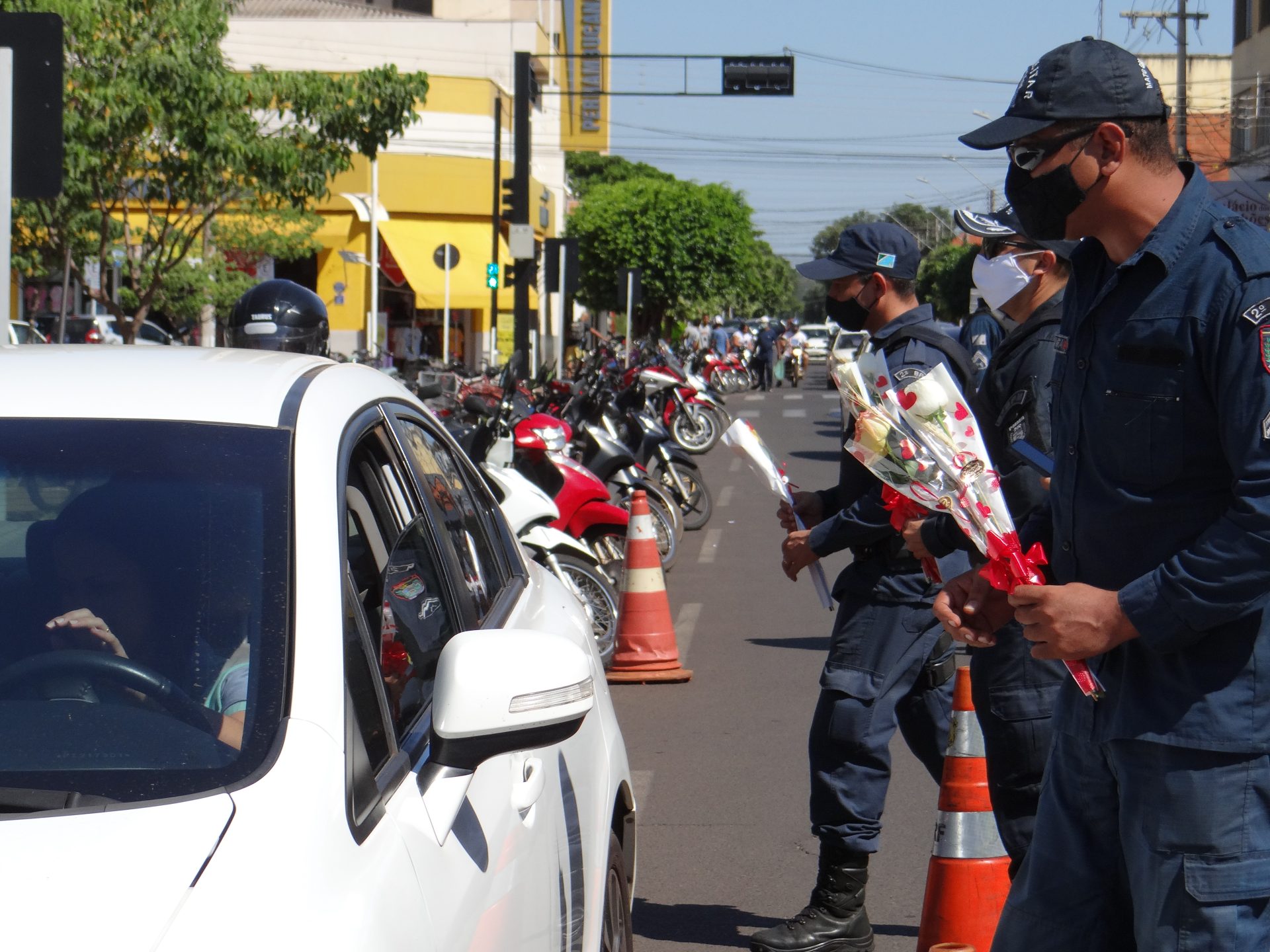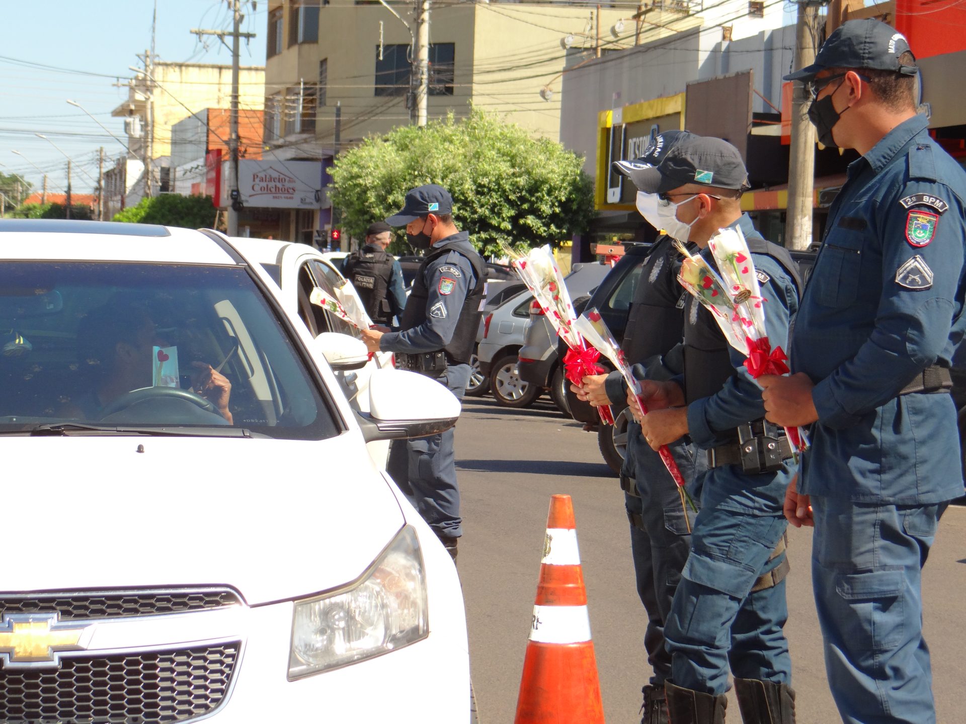 A “blitz” aconteceu na manhã desta terça-feira na Rua Paranaíba, ao lado da praça Ramez Tebet, onde diversos veículos foram parados pelos militares, porém, ao invés de uma abordagem padrão, os policiais entregaram um botão de rosa para as mulheres, além de palavras de carinho, gratidão e respeito.