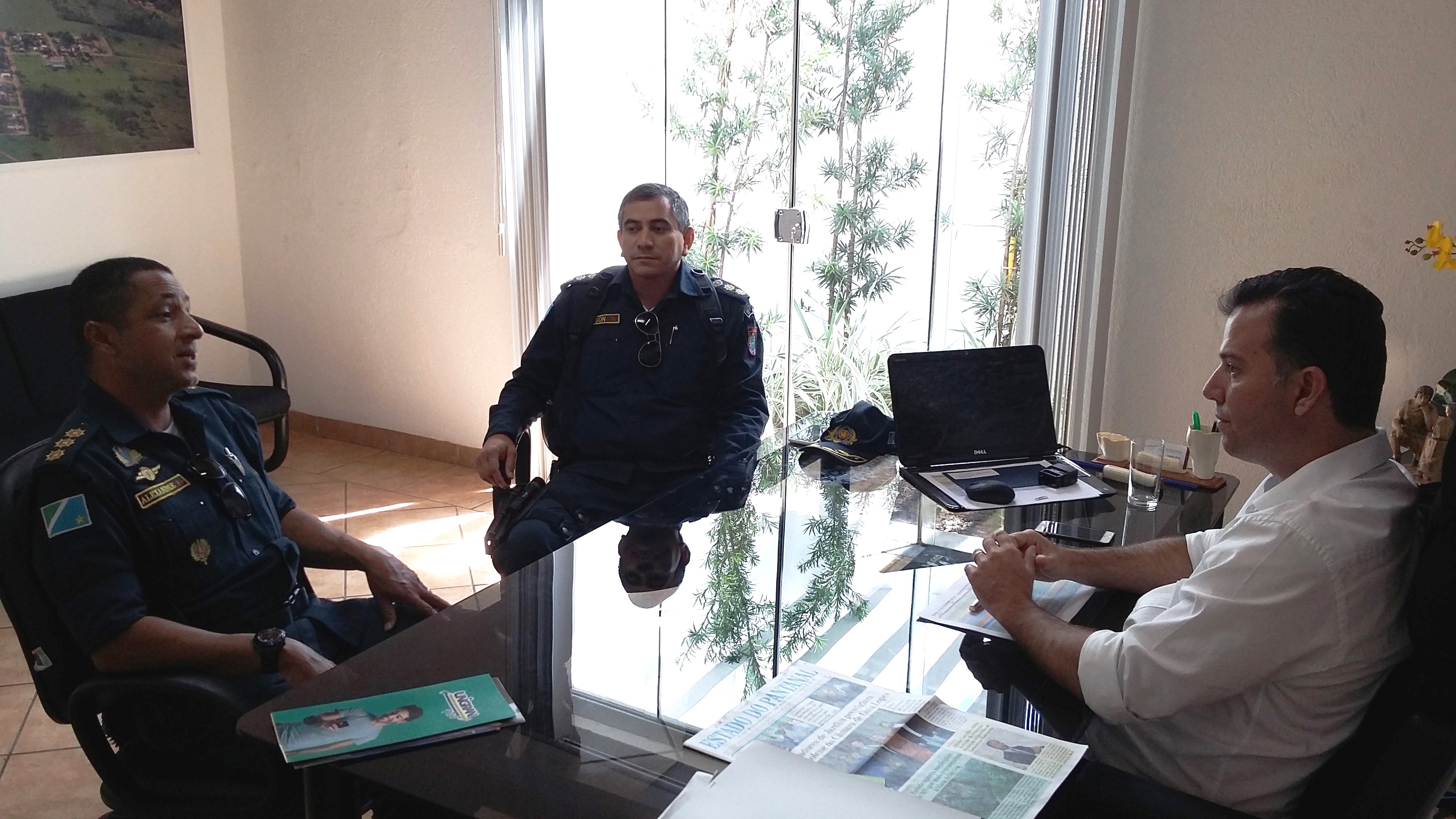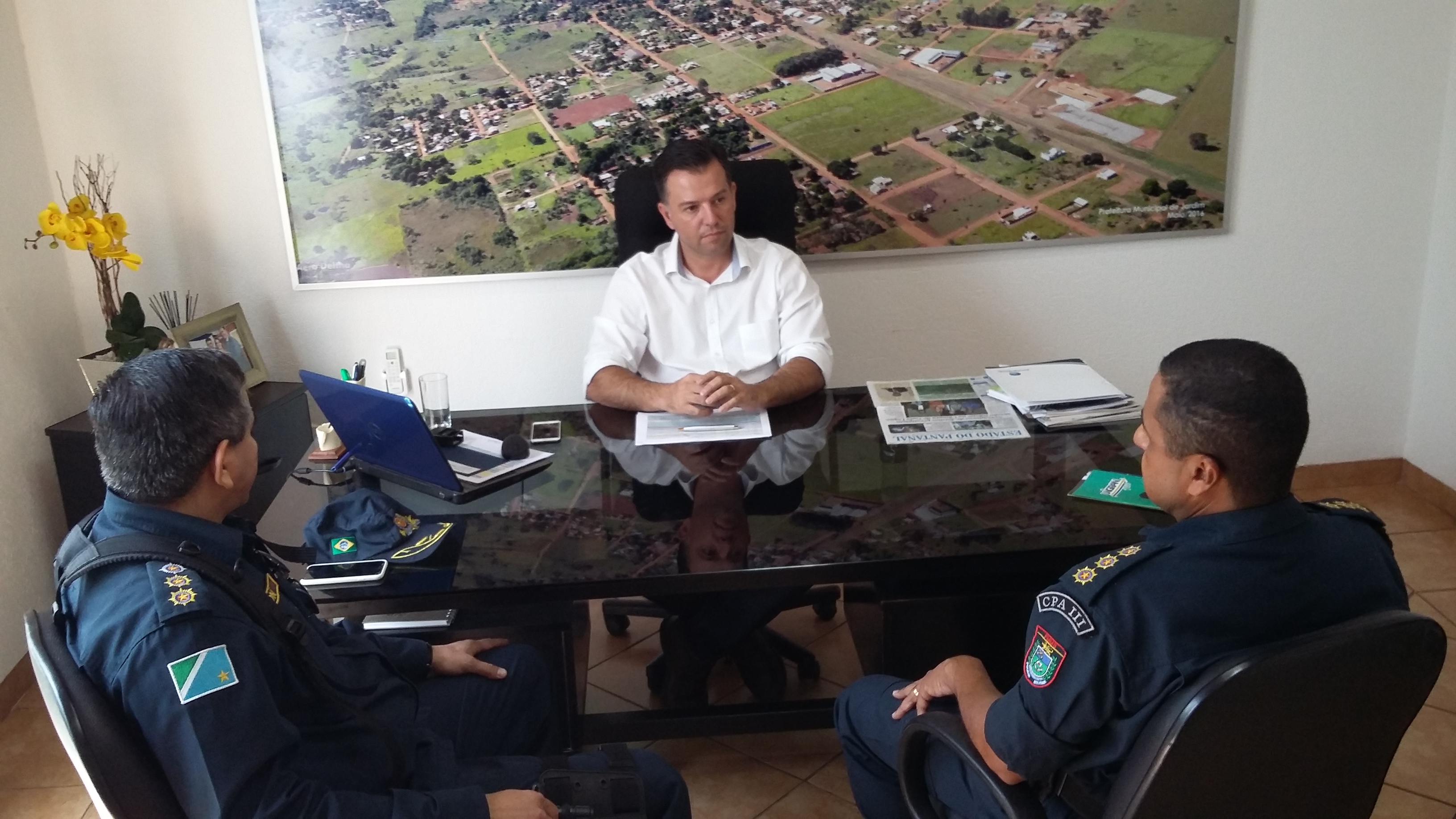 Posteriormente, o Comandante do CPA-3 e o Comandante do 11º BPM participaram de uma reunião com o Prefeito Municipal de Jardim, Exmo. Senhor Guilherme Alves Monteiro, a fim de discutirem parcerias e definirem metas de trabalho.