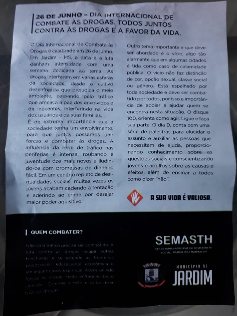 O objetivo da Semana Municipal de Combate às Drogas é orientar a população sobre a importância da prevenção ao uso indevido de drogas. Na ocasião, ocorreram apresentações de peças teatrais, finalizando com uma Palestra com o Professor Devanir Ramos, especialista em Prevenção às Drogas.