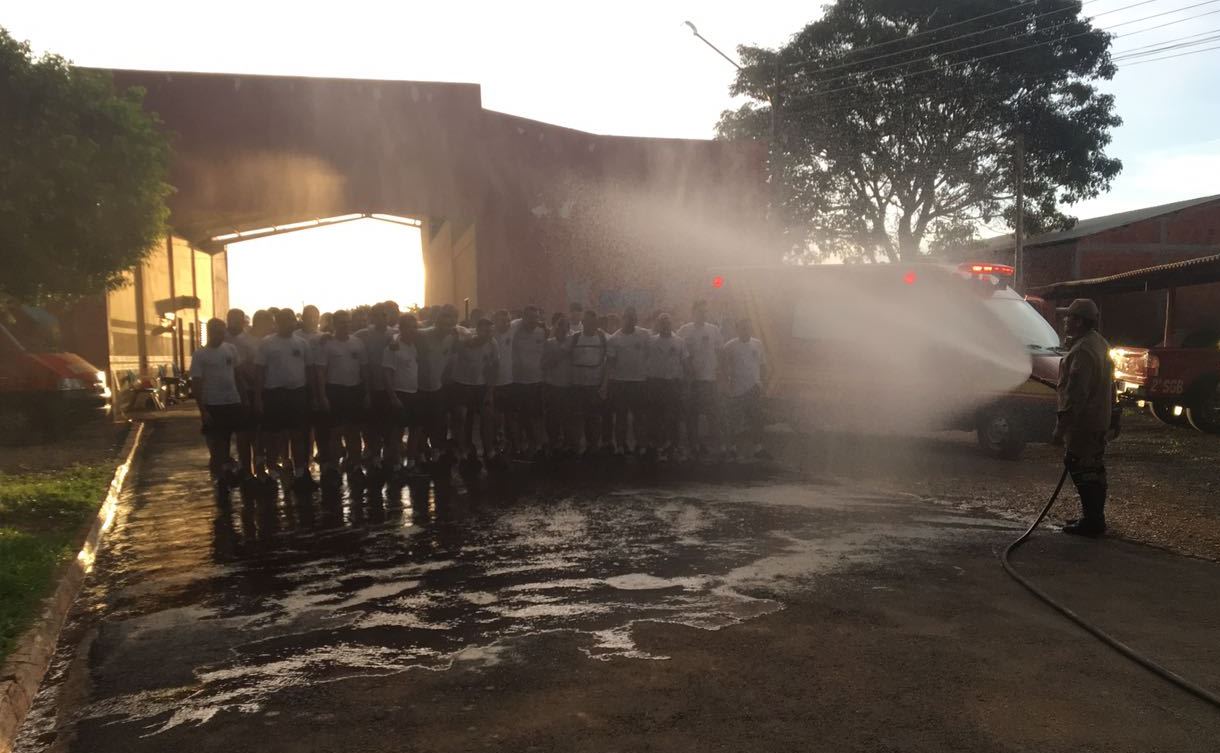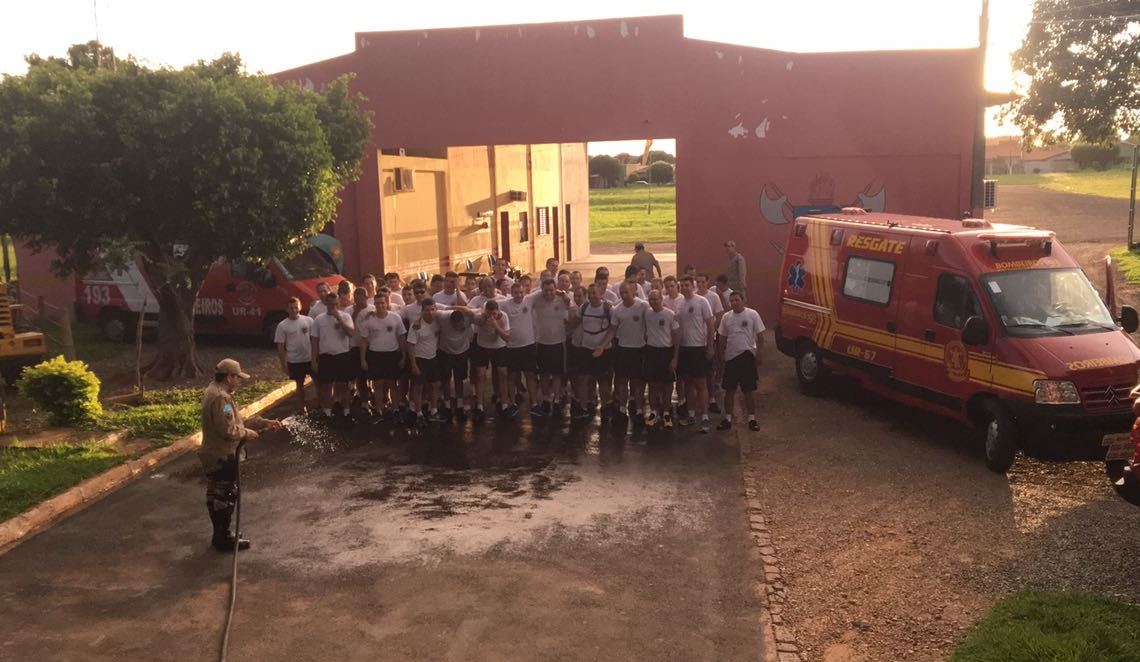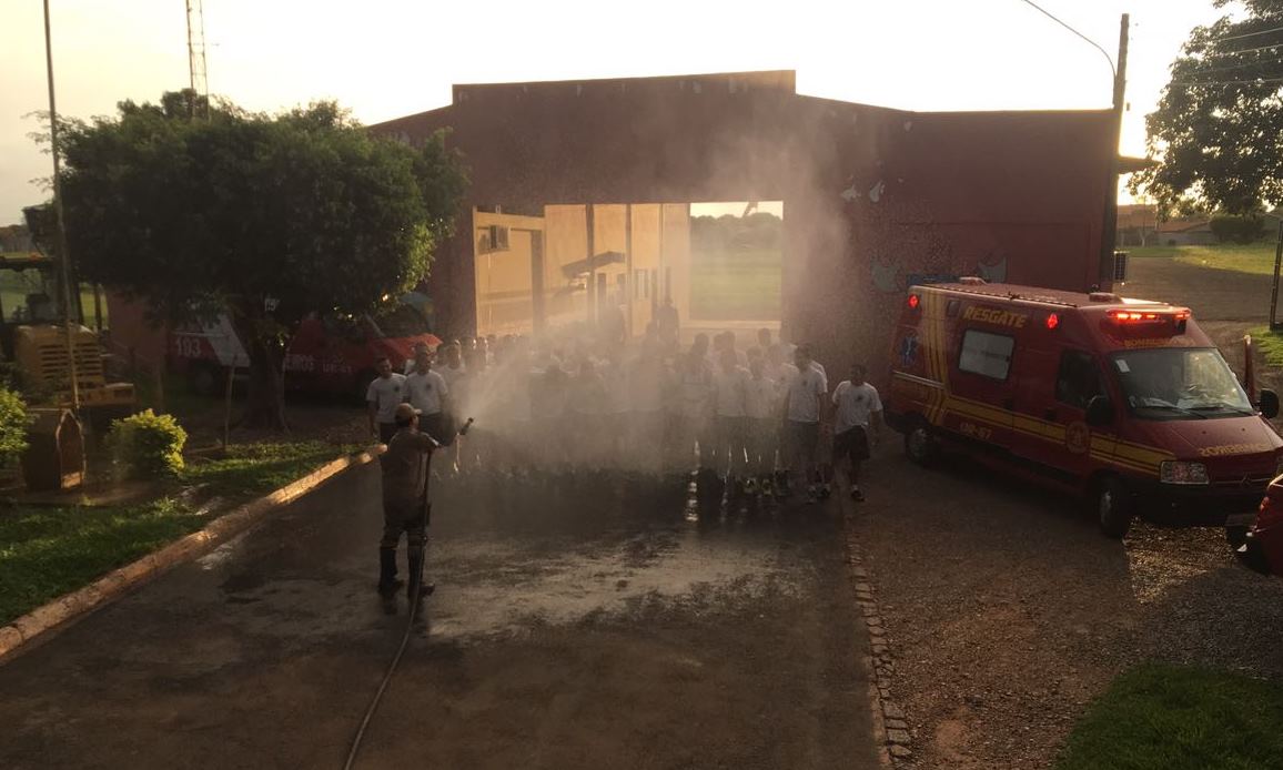Uma guarnição de Corpo de Bombeiros retribuiu a deferência lançando água nos Policiais, aliviando o calor da corrida e revigorando as forças da tropa para prosseguirem a instrução.