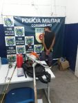 Ao se aproximar do local, a equipe avistou dois indivíduo, sendo um em frente a uma residência em posse de molinetes e uma mochila de cor preta e o outro, por sua vez empreendeu fuga ao ver a viatura policial, deixando para trás uma roçadeira.