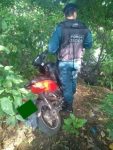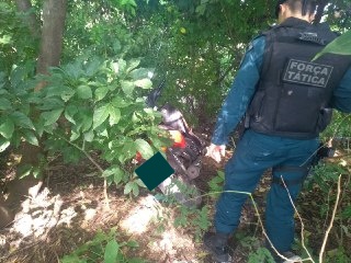 De imediato a equipe deslocou estrategicamente até o local onde com cautela adentraram em incursão pelo terreno baldio, e após uma varredura minuciosa, foi localizada, jogada ao solo em meio a um amontoado de mato, uma moto Biz de cor vermelha, que após checagem da placa junto ao sistema SIGO foi constatado ser produto de roubo.