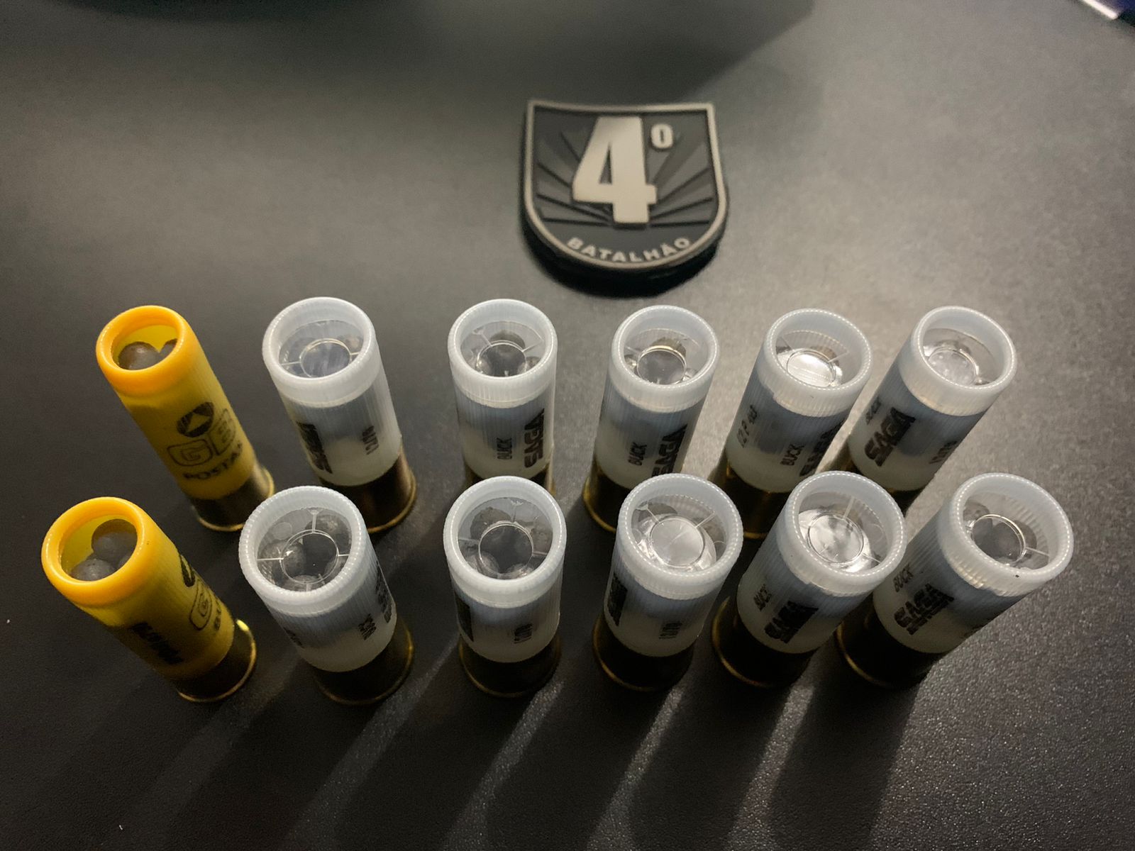 Durante a revista pessoal, foram encontrados no bolso da calça de um dos indivíduos dois cartuchos de munição calibre .20 e, durante revista no interior do veículo os policiais encontraram uma caixa com 10 (dez) cartuchos de calibre .12 que estava dentro de uma mochila no banco traseiro do veículo.