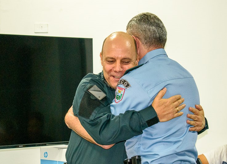 Imagem: Atual diretor da DPCOM, Coronel PM Alexandre Rosa Ferreira, cumprimentando o ex-diretor Coronel PM Thonny Audry Lima Zerlotti
