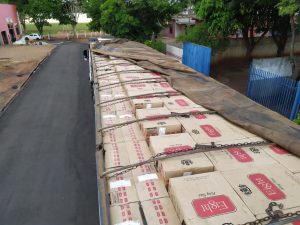 Ao ser questionado, o homem de 25 (vinte e cinco) anos, relatou que o caminhão estava carregado com 900 caixas (45 mil pacotes) de cigarros, da marca Eight, contrabandeados do Paraguai e em seu bolso, foi encontrada a quantia de R$ 1935,00 (um mil novecentos e trinta e cinco reais).