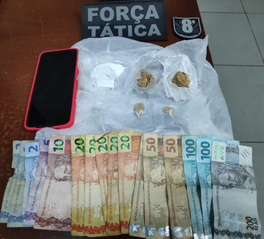 Diante do flagrante de crime de tráfico de drogas, o autor recebeu voz de prisão e foi encaminhado juntamente com droga e o dinheiro para a Delegacia de Polícia Civil para as demais providências