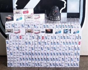 Por volta do meio-dia, uma Equipe Policial Militar do distrito de Sanga Puitã/4º BPM, abordou um grupo de mulheres que estavam em um ponto de ônibus na BR 463, onde de imediato informaram que estavam levando cigarros para a cidade Dourados/MS, sem documentos de origem, foi vistoriado as bagagens das autoras, sendo localizadas 194 (cento e noventa e quatro) pacotes de cigarros (marcas diversas) de origem paraguaia.