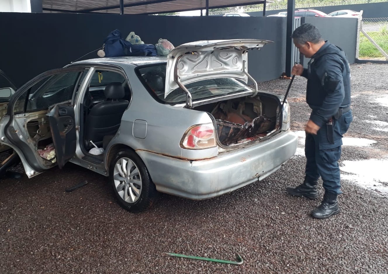 Ao retirar uma superfície com massa plástica, foram localizados diversos tabletes de maconha, que após retirados totalizaram 158 unidades, pesando 68 quilos ao total. Haviam tabletes da droga também nas portas do veículo.