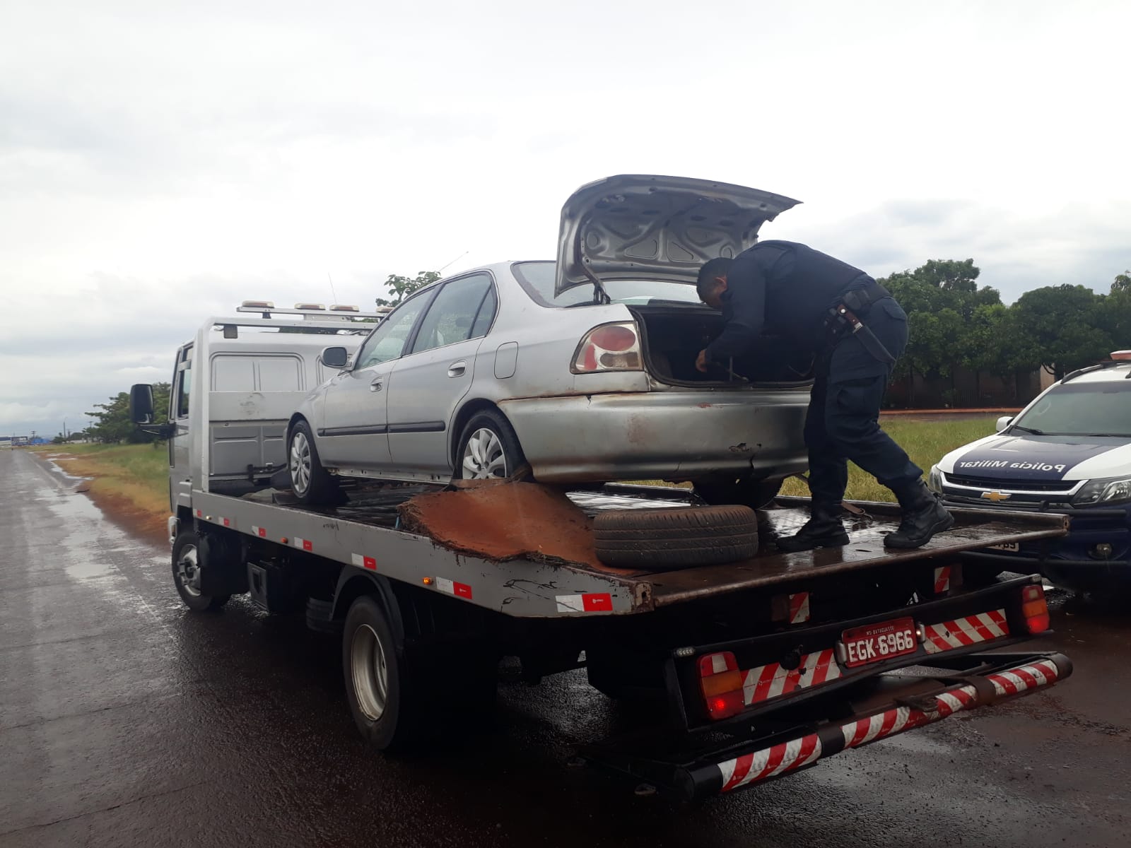 Os policiais militares realizavam rondas pelo Jardim São Francisco, quando no cruzamento com a MS 395, se depararam com um veículo Honda Civic de cor prata, que estava sendo transportado num guincho. Foi realizada a abordagem para fins de fiscalização, sendo que o motorista do guincho relatou que foi contratado para buscar o veículo na estrada do balneário em Anaurilândia, onde a condutora do Honda Civic alegou problemas mecânicos no carro.