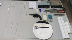 Na manhã deste sábado (18.09) a guarnição de Força Tática recebeu uma denúncia anônima que uma mulher havia adquirido certa quantidade de droga. Foi realizado diligencias na casa da acusada, encontrando-a embalando cocaína em pinos para comercialização. Questionada, a mesma disse que pagou trezentos reais pela droga, sendo que pagou cem reais a vista e o restante seria quitado após a venda do entorpecente, a mesma disse ainda que iria vender cada pinos de cocaína por cinquenta reais. A equipe fez uma busca na residência e encontrou em uma bolsa preta com mais 52 (cinquenta e dois) pinos vazios que seria cheio e comercializado. Durante a busca foi localizado uma arma de fogo calibre 38 sem numeração aparente com 5 (cinco) cartuchos intactos e uma balança de precisão. Sobre a arma a mesma disse que seria de uma amiga. Já na residência da pessoa que teria vendido a droga, foi encontrado vestígios de maconha, papel insulfilme e toca CD de origem duvidosa. Diante dos fatos ambos foram encaminhados para Delegacia de polícia civil para providencias.