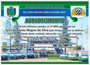 Por fim, os Polícias Militares lotados no 4º BPM agradecem ao Ten Cel Carlos Magno da Silva pelo tempo em que se dedicou como comandante desta unidade, deixando um rastro de amizade, lealdade, liderança e de profissionalismo ficando marcado Vosso nome na historia deste Batalhão.