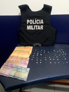 Foi realizada a abordagem ao autor já conhecido no meio policial por diversas denúncias da prática de tráfico de drogas. Ao ser entrevistado o ele demonstrou nervosismo e ao realizar a busca pessoal, foi localizado em um de seus bolsos uma carteira de cor marrom contendo 35 (Trinta e Cinco) cédulas de 2 (dois), 5 (cinco), 10 (dez), 20 (vinte) e 50 (cinquenta) reais, totalizando uma quantia de R$ 616,00 (Seiscentos e dezesseis) reais, ainda sendo encontrado na mesma carteira 7 (sete) porções de Crack.