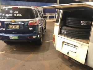 De imediato uma guarnição de serviço deslocou até o endereço indicado e deparou-se com um caminhão carregado com mercadorias de origem paraguaia. No local também havia um veículo Kombi, com placas de Rondonópolis/MT, carregado com 12 pneus da marca Sunset.