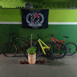 No terreno da residência, foram encontradas 03 (três) bicicletas com indícios de serem produto de roubo/furto, bem como 01 (uma) motocicleta sem placa de identificação, sendo que em checagem nos sistemas de restrição criminal, foi verificado que se tratava de produto de furto ocorrido no ano de 2014 na cidade de Amambai.