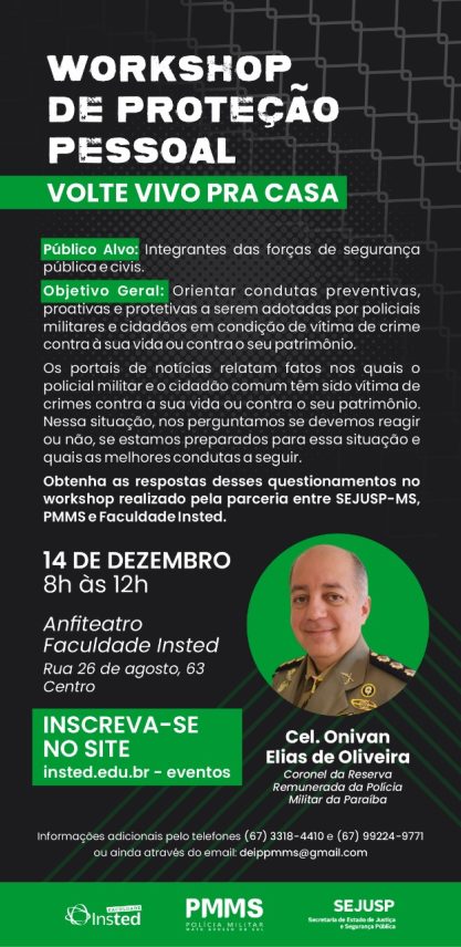 Campo Grande (MS) – Tendo como público alvo integrantes das forças de segurança pública, bem como público civil, será realizado o Workshop de proteção pessoal “Volte vivo para casa”, uma parceria entre a Sejusp (Secretaria de Estado de Justiça e Segurança Pública), PMMS e Faculdade Insted.