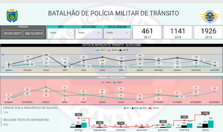 As Fiscalizações visando inibir a alcoolemia, intensificaram durante todo o ano de 2019 e até o momento foram feitos 1926 autos de infrações por embriaguez e recusar-se a submeter ao teste, ultrapassando, já no primeiro semestre, todo ano de 2018.