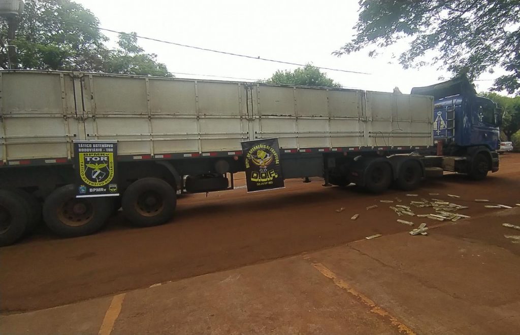 Campo Grande (MS) – Policiais do Departamento de Operações de Fronteira (DOF) apreenderam, na madrugada de hoje (13.05), uma carreta Scania de cor azul, com placas do Paraguai, que estava carregada com arroz, tendo um fundo falso no semirreboque, onde estavam 830 quilos de maconha, distribuídos em volumes prensados.