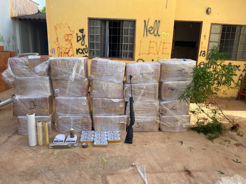 Durante o desdobramento da abordagem, os indivíduos informaram a existência de mais entorpecentes em uma residência próxima. Seguindo as informações fornecidas, os policiais se dirigiram ao local indicado e se depararam com uma grande quantidade de drogas. No total, foram apreendidos 722 Kg de maconha e 9,4 Kg de pasta base de cocaína, além de diversos materiais relacionados ao tráfico, como rolos de plástico filme, embalagens plásticas e balanças de precisão.