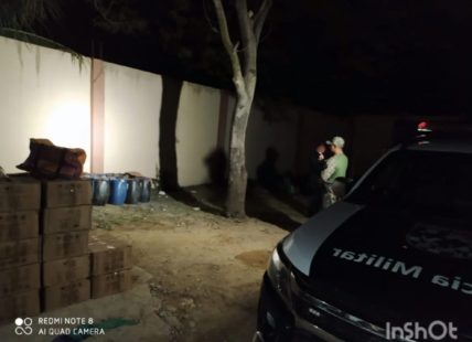 Foi acionada a equipe da Policia Militar Ambiental e a equipe da Receita Federal, haja vista, a quantidade de combustível armazenado no local de forma irregular e o material produto de descaminho. Posteriormente, foi verificado pela equipe da Receita mais produtos irregulares, porém seus proprietários não foram encontrados.