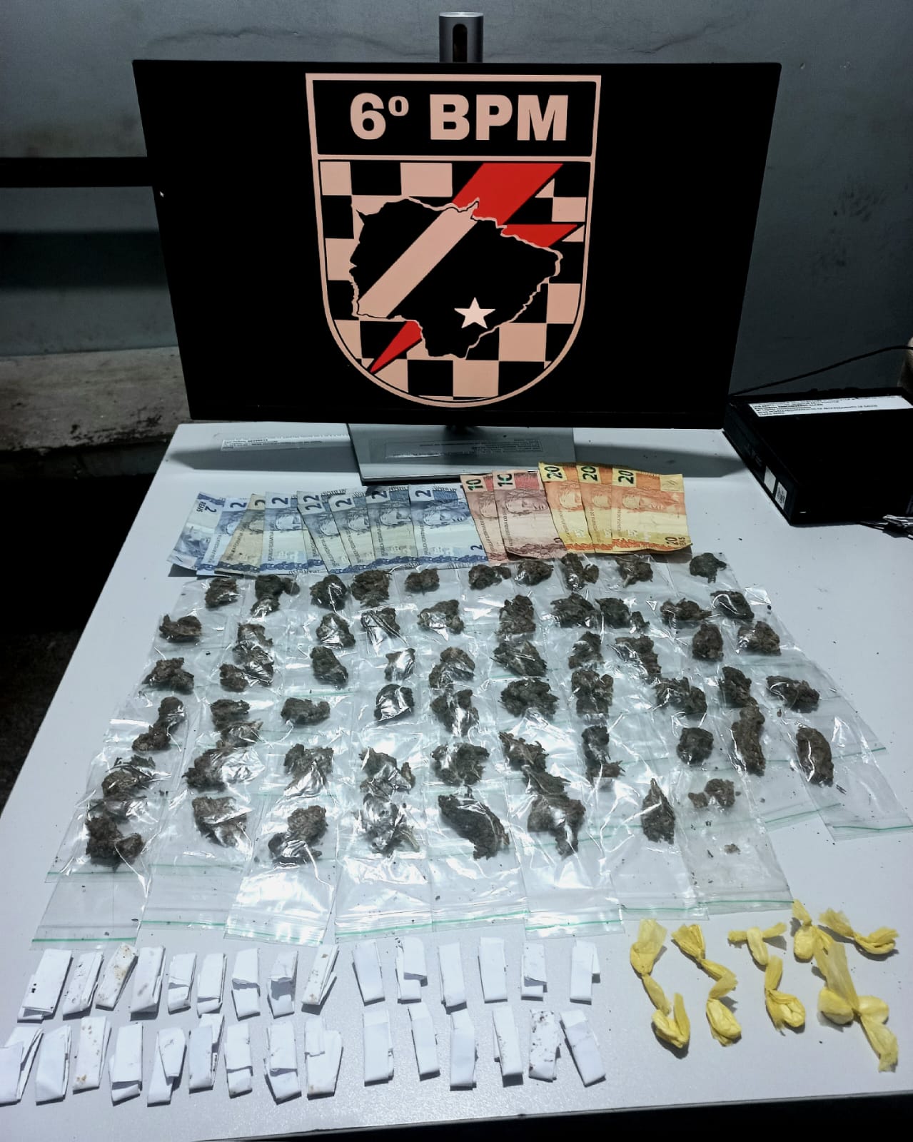 Diante dos fatos, adentrou no barraco que é abandonado, onde abordou no fundo do imóvel o indivíduo de 32 anos que tentava esconder duas sacolas atrás de uma lata de tinta, sendo que dentro das sacolas foram localizados mais 48 invólucros de maconha, 30 papelotes de pasta base, 10 trouxinhas de cocaína e a quantia de R$ 98,00 reais em cédulas fracionadas.