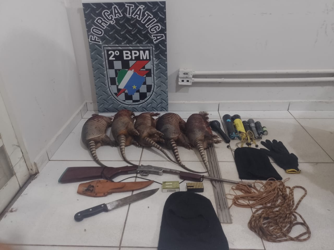 Ao serem entrevistados pela Equipe Policial, os envolvidos confessaram que estavam praticando a caça. No interior carro foi localizado uma espingarda calibre .22, os cinco Tatus mortos, as munições de calibre .22 intactas e todo material utilizado para caça (luvas, faca, toucas, lanternas e cordas).