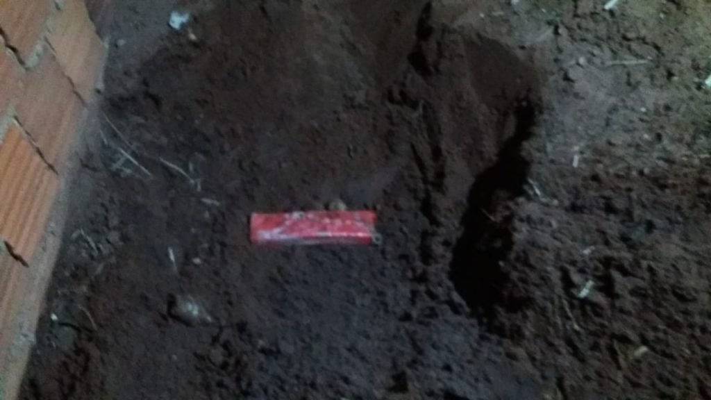 Diante as informações a guarnição de Força Tática do 2º BPM deslocou até o local relatado onde após contato com a genitora do adolescente, realizaram buscas no imóvel, logrando êxito em encontrar 01 “tablete” de maconha pesando 346 gramas e o segundo “tablete” enterrado próximo ao muro, que pesou cerca de 810 gramas.