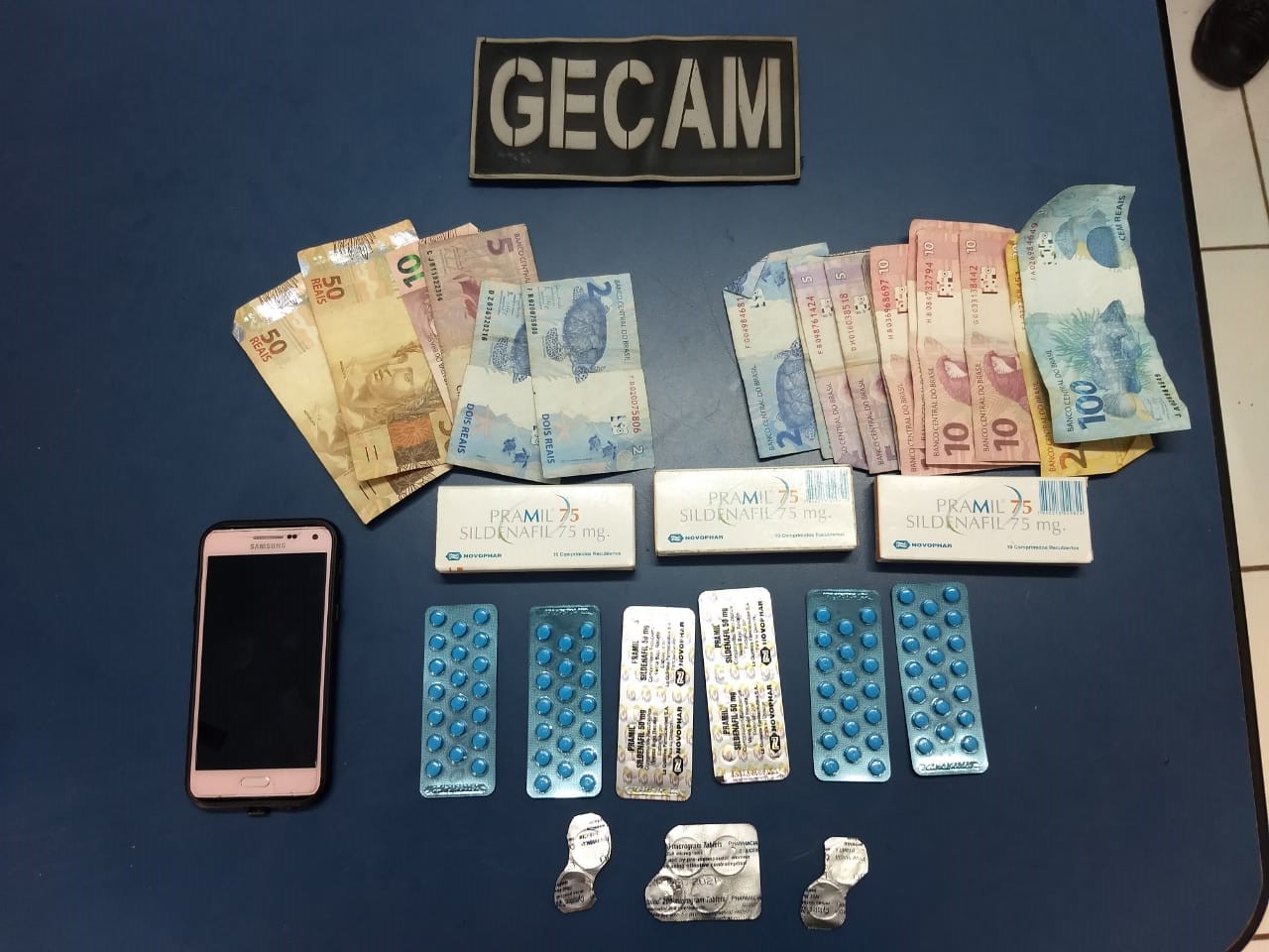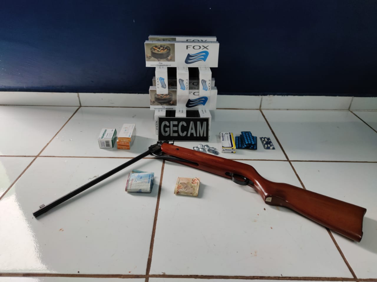 Indivíduos são presos com arma de pressão adaptada para calibre 22, contrabando e venda de medicamentos pela Polícia Militar na região central de Campo Grande – MS na primeira Operação Laburu do ano.
