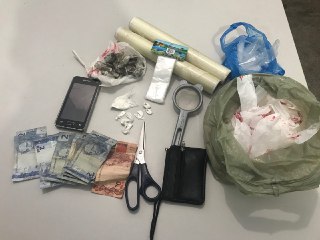 Entretanto, a busca foi realizada sendo encontrados 19 trouxinhas de maconha, 07 trouxinhas contendo cocaína e 01 embrulho com aproximadamente 10g de cocaína, dinheiro e material para confecção de drogas para comércio.