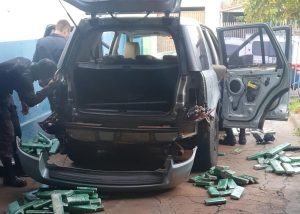 A guarnição realizou a desmontagem das partes internas do carro, sendo localizado em vários compartimentos ocultos, 152 “tabletes” maconha, totalizando 152 kg, droga esta foi apresentada da delegacia de polícia juntamente com o veículo.