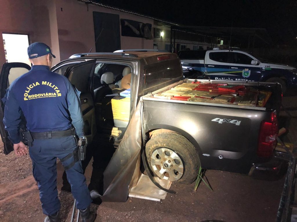 Em vistoria ao veículo, foi constatado que o mesmo estava carregado com diversos tabletes de maconha, ostentava placas adulteradas e que possuía queixa de roubo/furto do dia 01/02/20 na cidade de Maracajú – MS, rádio transceptor oculto no painel e um dispositivo abaixo da caminhonete, que liberava “ouriços” para furar os pneus da viatura em caso de acompanhamento tático, que acabou não sendo usado, graças a ação rápida da equipe da PMR.