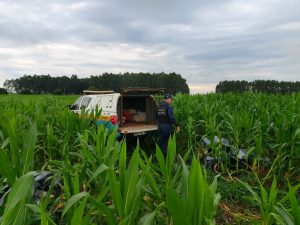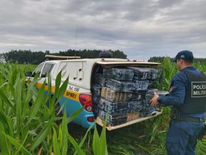 Durante policiamento e fiscalização de trânsito e criminal na Rodovia MS 156 e vicinais de Caarapó, com objetivo de coibir crimes transfronteiriços, a equipe da PMR visualizou às margens de uma estrada vicinal existente nas proximidades do contorno rodoviário da BR 163, sacos de lixo de cor preta vazios espalhados pelo chão e marcas de pneus de automóveis que adentraram uma lavoura de milho.