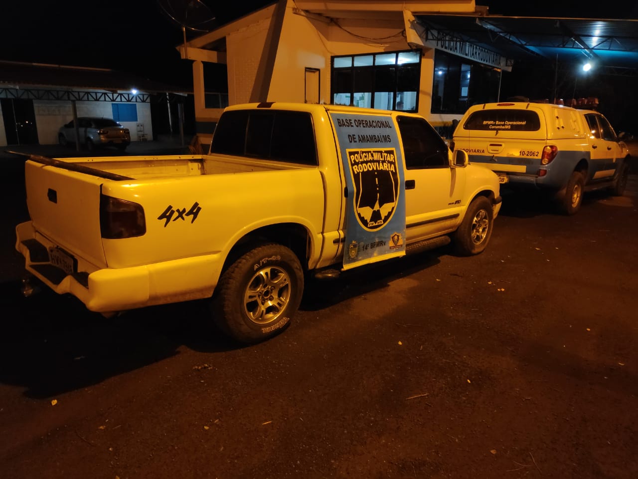 A apreensão ocorreu na MS 156, após informações sobre um veículo parado às margens da rodovia entre Tacuru e Amambai. A equipe da Polícia Militar Rodoviária diligenciou pelo trecho, localizando o veículo S-10/GM de cor branca, com placas de Videira – SC, com as portas destravadas e sem chave de ignição. O condutor não foi localizado e não foi encontrado nenhum ilícito em seu interior, mas após checagem do chassis, foi constatado que o veículo ostentava placas frias, sendo as originais da cidade de Ponte Serrada – SC, com registro de roubo/furto.
