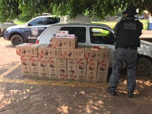 A guarnição Policial estava fazendo policiamento ostensivo preventivo, quando avistou um veículo branco com vidros lacrados e suspensão baixa deslocar em alta velocidade pela Rodovia MS-164, no sentido Ponta Porã x Posto Aquidaban (PRE-MS). O condutor ao perceber a presença dos policiais tentou fugir por uma estrada vicinal, sendo realizado acompanhamento tático. Ao realizar abordagem foi localizado no interior do veículo 17 (dezessete) caixas de cigarros de origem estrangeira da marca Eight. Os envolvidos receberam voz de prisão por Contrabando e foram orientados sobre seus direitos constitucionais, sendo encaminhados à Policia Federal de Ponta Porã-MS para as providencias cabíveis.