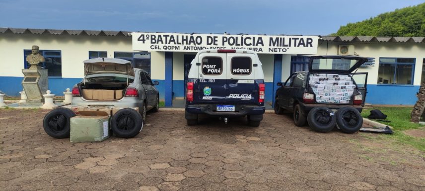 Foi realizada a devida checagem e verificação no interior dos veículos, um Fiat Uno e um VW Voyage, no interior de ambos os veículos foi encontrado 30 caixas de cigarro, 28 pneus de tamanhos variados e 2100 unidades de óculos, causando um prejuízo aproximado de R$ 129.000,00 (cento e vinte e nove mil reais).