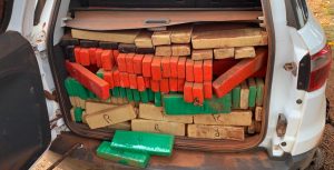 O veículo que fora abandonado trata se de um Ford, Ecosport, com placas de Rio Brilhante/MS, e no interior do veículo foi encontrado uma certa quantia de maconha envolta em fita adesiva nas cores bege, verde, preta e vermelha que estavam acondicionadas no porta malas do veículo, sobre o banco traseiro, sob os bancos dianteiros, e também foi encontrado uma certa quantia dessa mesma substância esverdeada em um outro tipo de embalagem a vácuo.