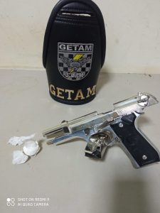 Durante uma ação na noite desse domingo na região do trevo do DOF, uma equipe do GETAM fez a apreensão de uma pistola calibre 9mm e também uma porção de cocaína em três papelotes que totalizaram 5,3 gramas da droga.