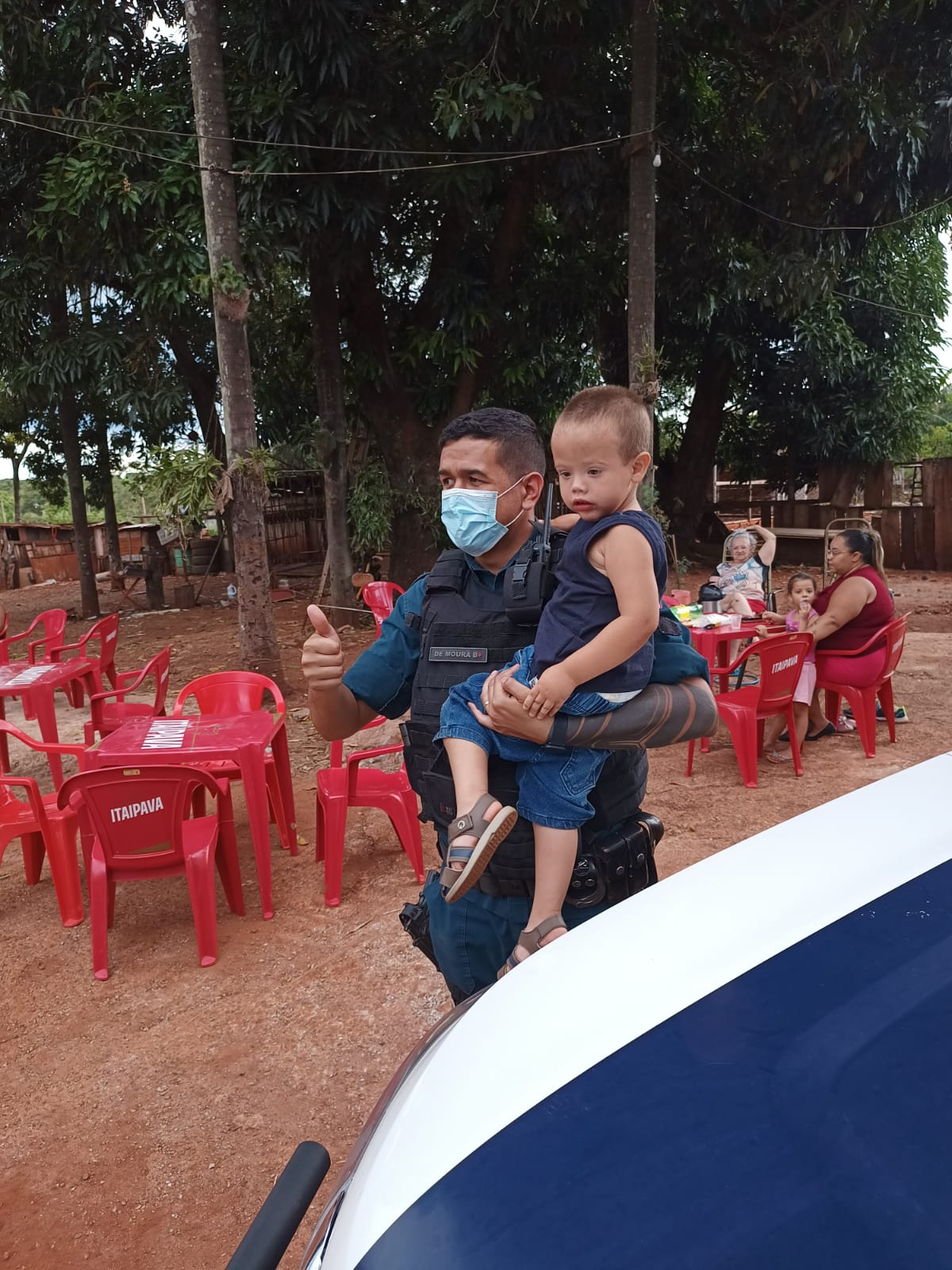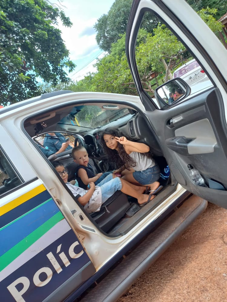O momento em que a viatura policial chegou no local, com as luzes e sinais sonoros ligados, chamou a atenção das crianças ali presentes. Foi uma surpresa para o aniversariante e as demais crianças, que ficaram eufóricas com os policiais, a viatura e os equipamentos utilizados no serviço policial.