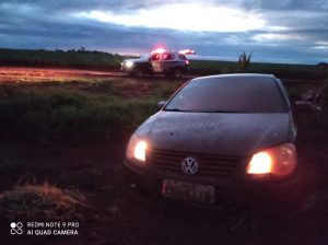 A Equipe Policial Militar realizou acompanhamento tático, quando ao chegar no fim da pista asfaltada, o condutor do veículo roubado perdeu o controle da direção, vindo a atolar em uma “vala” entre as duas pistas.