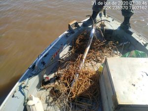Durante o patrulhamento fluvial foram retirados do rio oito cordas de espinhéis com 160 anzóis ao todo, 48 anzóis de galho e dois “joão-bobos-boias”. Foram soltos no rio vários peixes que estavam presos aos petrechos ilegais. Os infratores que armaram os petrechos não foram localizados.