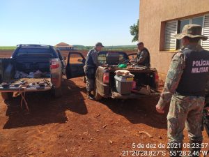 Os Policiais encontraram uma espingarda da marca Rossi calibre 38 municiada e carregada dentro de um veículo Chevrolet S10, que pertencia ao infrator, para a qual não havia documentação. Ele recebeu voz de prisão pela posse ilegal da arma. No interior da casa abandonada, além de colchões e roupa, foi localizado em uma caixa térmica um animal silvestre abatido da espécie paca (Cuniculus paca) e na cozinha um tatu-galinha também abatido (Dasypus novemcinctus), ambos em extinção. O homem disse não saber quem do grupo havia abatido os animais e que eram mais nove caçadores que portavam rifles, espingardas, fuzis e revólveres, em dois veículos do tipo camionete, uma motocicleta e cães farejadores.