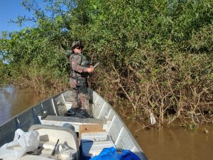 Campo Grande (MS) – Uma das equipes de Policiais Militares Ambientais de Miranda, que trabalha na operação piracema, realizou fiscalização preventiva nos rios Miranda, Chapena e Betione, desde a madrugada de hoje (11) ao início da noite e apreendeu um barco e diversos petrechos ilegais de pesca.
