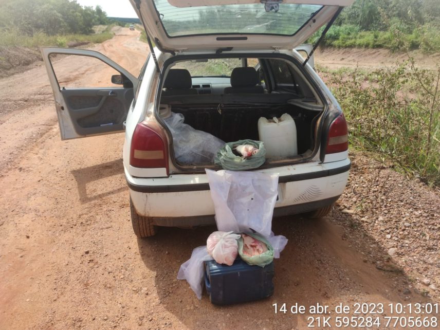 Depois de receber denúncias de que haveria pescadores praticando pesca predatória no rio Miranda, o Comando da PMA do Grupamento do Distrito colocou uma equipe pelo rio e outra equipe fazia fiscalização ambiental em bloqueio na rodovia, na área pela qual os infratores poderiam empreender fuga da equipe de rio. Os Policiais em bloqueio abordaram então um veículo VW Gol, onde estava o infrator e encontrou nos espaços entre o motor do veículo um exemplar de pescado da espécie cachara sem cabeça, um exemplar de pescado da espécie pintado sem cabeça, os dois pesando 3 kg, e 3,5 kg de filé de pescado da espécie jaú, totalizando 6,5 kg de pescado fresco.
