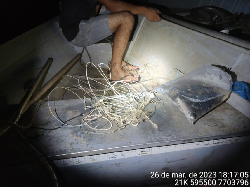 O pescador estava em uma embarcação motorizada, quando foi abordado armando anzóis de galho. Na embarcação havia anzóis e 13 peixes que estavam sendo usados como iscas. Ao todo foram retirados do rio e apreendidos na embarcação, 14 anzóis de galho pertencentes ao infrator e os 13 peixes usados como iscas, além da embarcação e o motor de popa.