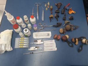 Remédios, seringas, esporas, biqueiras e outros materiais para uso nos galos.