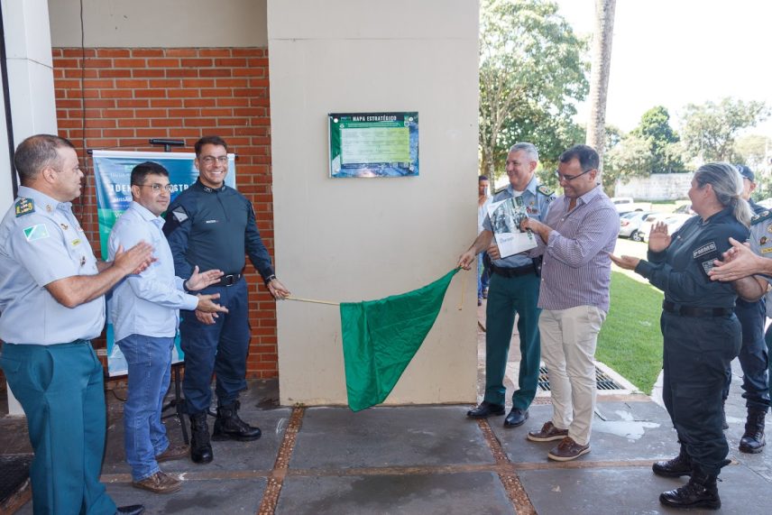 A frente do Comando Geral da PMMS foi realizado o descerramento da placa do Mapa Estratégico da Polícia Militar de Mato Grosso do Sul.