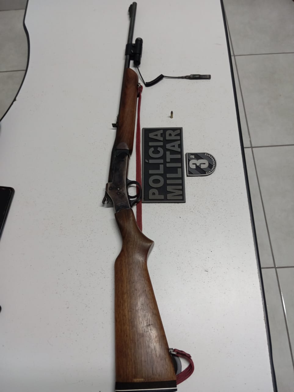 A PM foi acionada por uma mulher (41 anos) que relatava que seu companheiro (41 anos) tinha feito ameaças de morte por mensagens e que naquele momento ele a impedia de entrar na própria casa. A equipe deslocou prontamente e no local constatou os fatos, foi informada sobre a existência de uma arma no interior da residência e com a devida autorização localizou uma carabina Taurus calibre 22 que não tinha o devido registro de posse.
