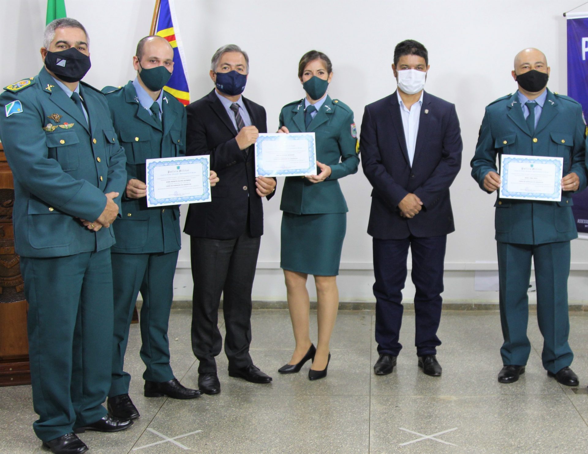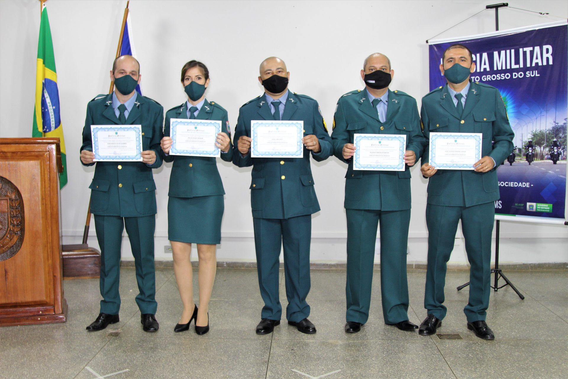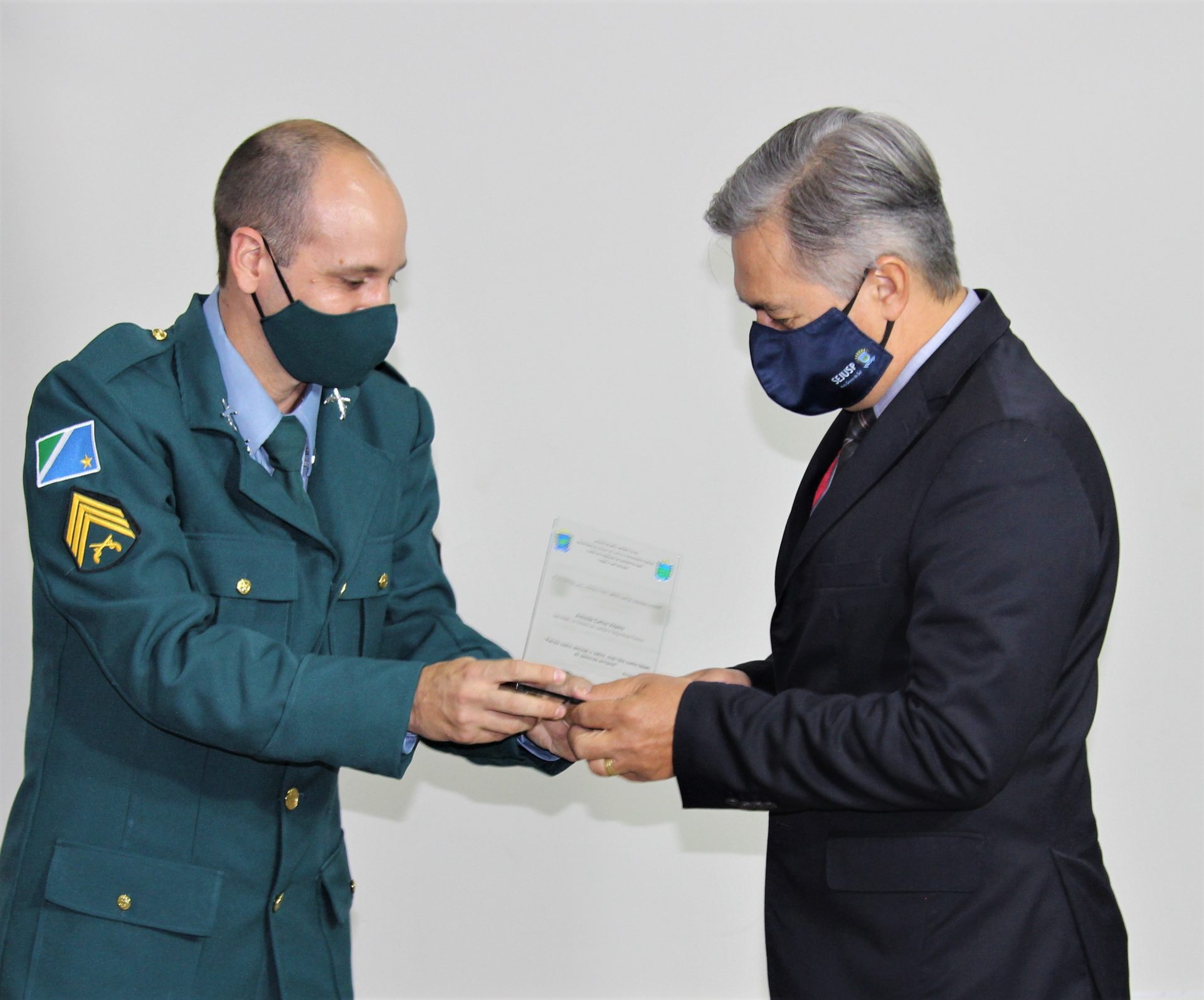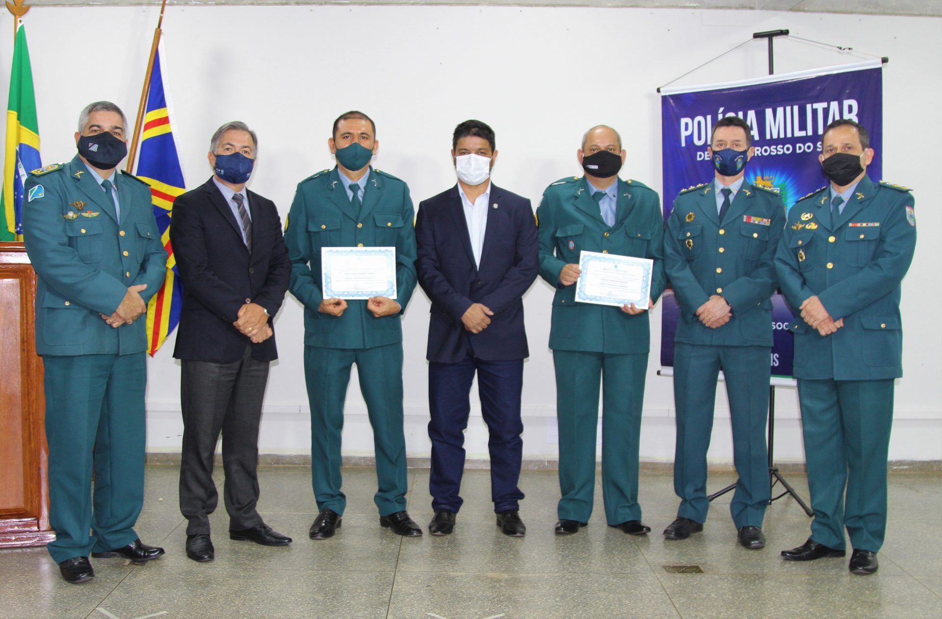 A Senhora Maria Inês Rossi, genitora do 3º SGT PM Eduardo Rossi Góes (in memorian), que foi homenageado pela turma CFS 2020, a Cabo PM Rosemeire Dias de Souza Silva, paraninfa da turma, o Capitão PM Paulo Cezar Padilha, patrono da turma, o Coronel PM Marcos Paulo Gimenez, Comandante-Geral da PMMS e o Secretário de Estado de Justiça e Segurança Pública, Antonio Carlos Videira, receberam placas com homenagens da turma do CFS 2020.